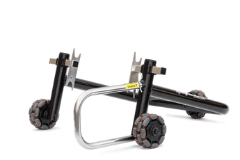 Single-sided Rear Stand: Fits bikes with a single-sided swingarm and a large central hollow in the rear wheel hub. Interchangeable spindles easily adapted for different brands of bike: BMW, Ducati, MV Agusta, Honda, KTM, Triumph.