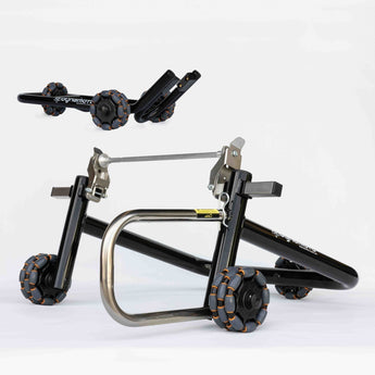 Single-sided Rear Stand: Fits bikes with a single-sided swingarm and a large central hollow in the rear wheel hub. Interchangeable spindles easily adapted for different brands of bike: BMW, Ducati, MV Agusta, Honda, KTM, Triumph.